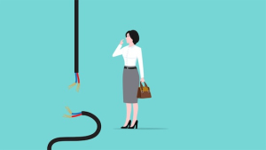 lost connection, system error or broken page, Disconnected wires from the outlet, 404 error page not found on website, server problems or loss of signal, confused businesswoman with disconnected cable